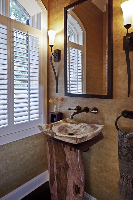 This gorgeous custom-built home is located in Owings Mills, Maryland. Adding to the beautiful countryside of Baltimore County, the homeowners have chosen arched walkways and windows, a natural stone wall in the kitchen, and detailed trim panels at the front entry.